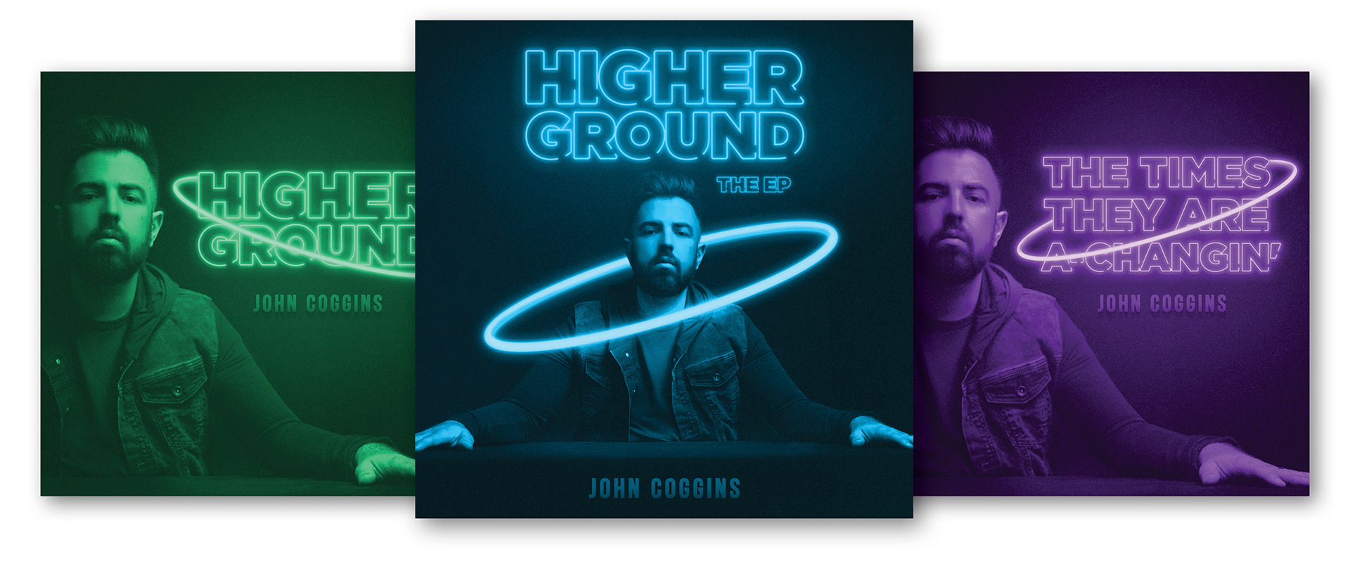 Musician John Coggins was preparing to release his four-song EP, Higher Ground. I was tasked with designing artwork for two singles to be teased before the album’s release, as well as the artwork for the EP itself. The challenge was to create a distinctive yet cohesive visual identity for all three releases.